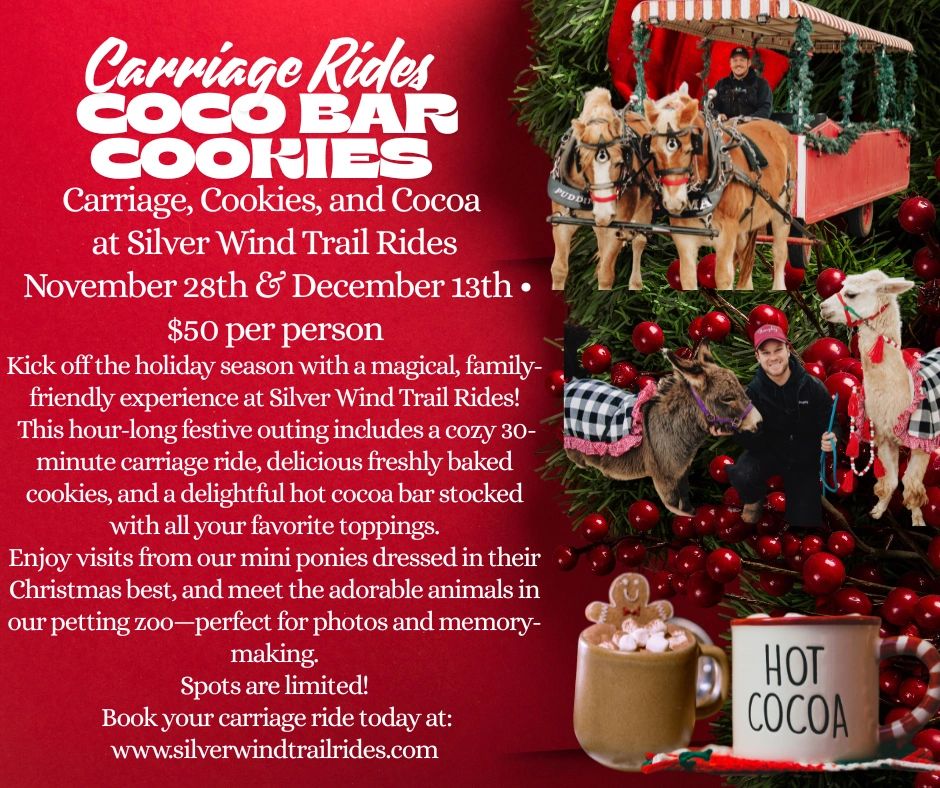 Kick off the holiday season with a magical, family-friendly experience at Silver Wind Trail Rides! This hour-long festive outing includes a cozy 30-minute carriage ride, delicious freshly baked cookies, and a delightful hot cocoa bar stocked with all your favorite toppings.